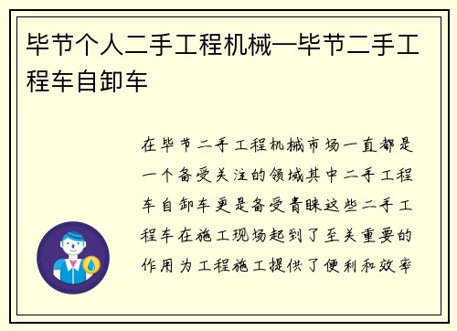 在毕节,二手工程机械市场一直都是一个备受关注的领域,其中二手工程车自卸车更是备受青睐。这些二手工程车在施工现场起到了至关重要的作用,为工程施工提供了便利和效率。下面我们就来详细了解毕节个人二手工程机械中的二手工程车自卸车。