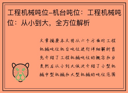 文章摘要:本文将从六个方面对工程机械吨位-机台吨位进行详细解析。首先介绍了工程机械吨位的概念和分类,然后从小到大依次介绍了小型机械、中型机械和大型机械的吨位范围和适用场景。接着,对工程机械吨位的选择因素进行了分析,包括工程需求、作业环境和成本等方面。然后,对机台吨位进行了解释,并介绍了机台吨位对工程机械的影响。对全文进行总结归纳,强调了工程机械吨位选择的重要性。